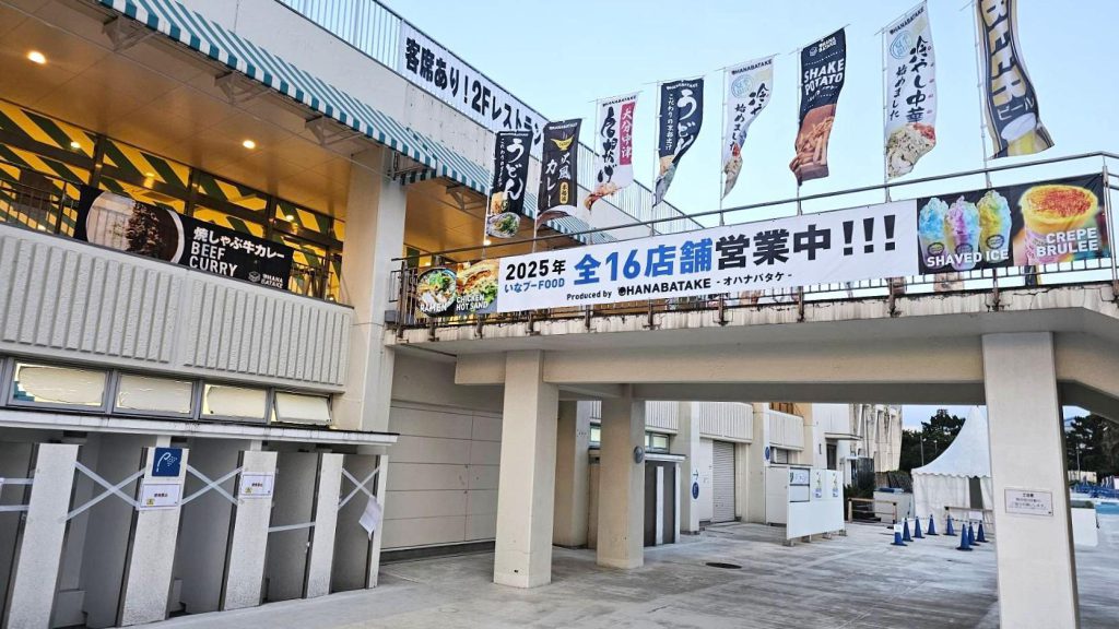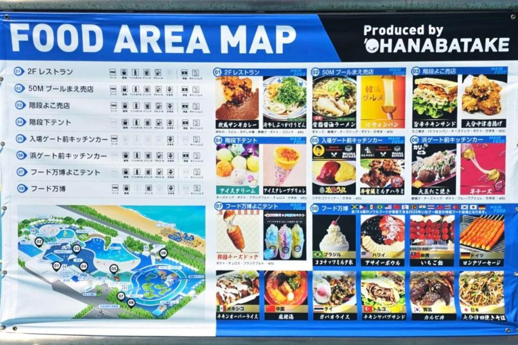 稲毛海浜公園プール内に「’OHANABATAKE」のホットサンド専門店京都ラーメン専門店など16店舗もの本格的な飲食店を運営。また世界16か国の「フード万博」を開催、ナイトプール縁日を設けるなど市民プールに来たとは思えないほどの満足度があります。