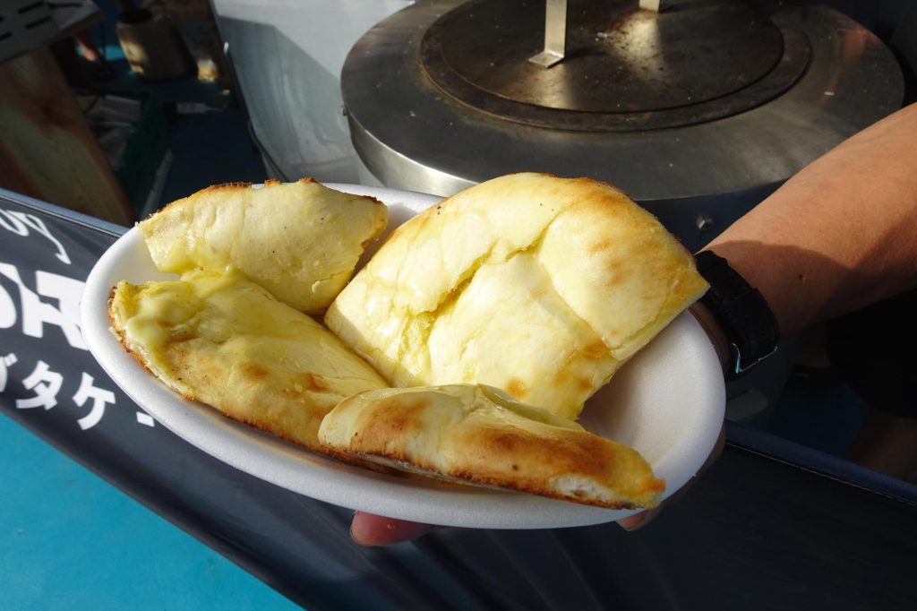 炭火で熱く焼かれた香ばしい生地に、しっかりとしたチーズが入っています。皆で分けて食べても十分のボリュームです。いろいろな種類のフードを買って分け合うのも楽しいですね。